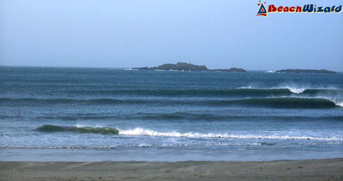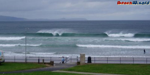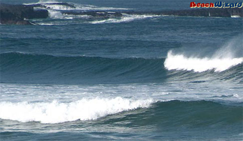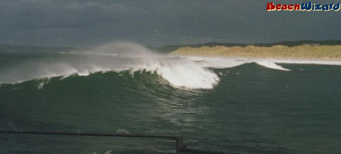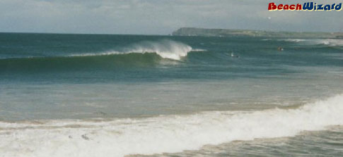 The picture below shows the East Strand, everybody should know that. The west is the one at the harbour. The waves at the east are excellent in autumn and winter. When the swells up, the waves are huge-about 8 ft and they have a radical punch if you wipe out. The west beach hasn't got much of a kick in the wave. The east is undoubtably the best.